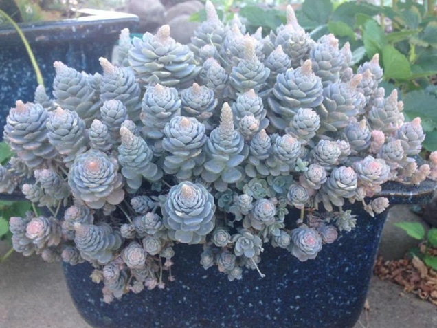 Esta suculenta inusual proviene de China. Sus hojas vienen en varios tonos de verde, azul y morado. Precisa pleno sol y produce flores de color blanco y anaranjado en otoño.