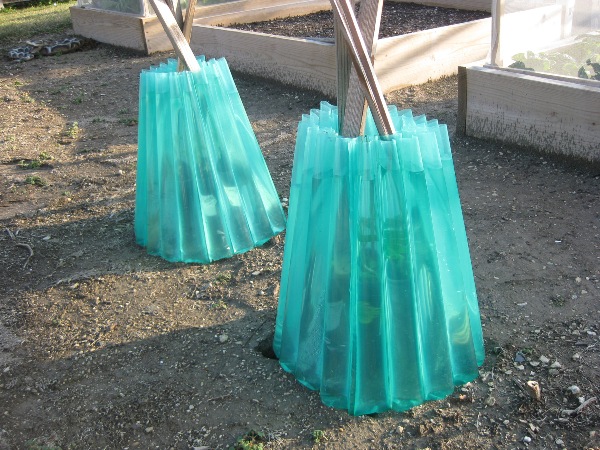 Una protección barata y eficaz es usar garrafas plásticas cortadas por la mitad. Las colocamos encima de las plantas y les quitamos el tapón para que circule el aire. Nos asombrará la eficacia de este sencillo y fácil mini-invernadero.