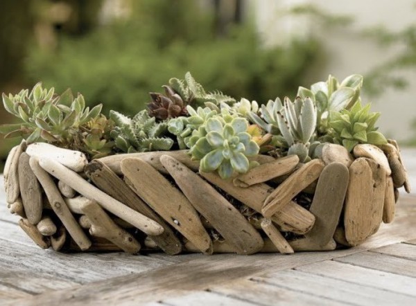 Con unos cuantos palitos bien trabajados por el agua podemos elaborar una bella cesta colgante para cualquier planta.
