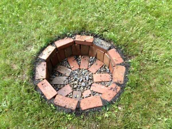 Cuando el hoyo tenga unos 35 cm de profundidad, más o menos, estará listo para comenzar la construcción. Simplemente hemos de ir colocando los ladrillos tal como se ve en la imagen superior y rellenando los huecos con la grava o piedra volcánica que hayamos elegido. También se puede usar hormigón o mejor cemento refractario para fijar definitivamente los ladrillos. Esto es imprescindible si vives en un área geográfica de inviernos muy duros. Lo bueno de usar grava o piedra volcánica suelta es que puedes revertir fácilmente la hoguera cuando ya no la quieras tener en activo. Y por último ¡a disfrutar de tu hoguera de jardín!!