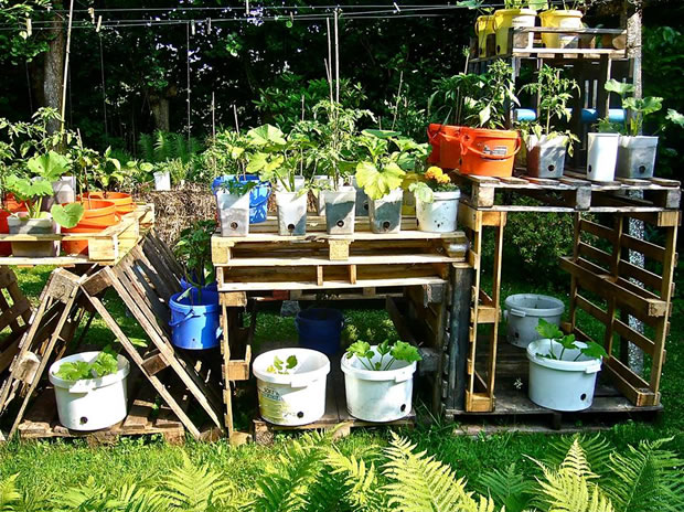 Una cama elevada es otra idea excelente y muy fácil de llevar a cabo con un palet y si además lo pintas, como en la imagen superior, tendrás un bonito elemento decorativo en tu jardín.